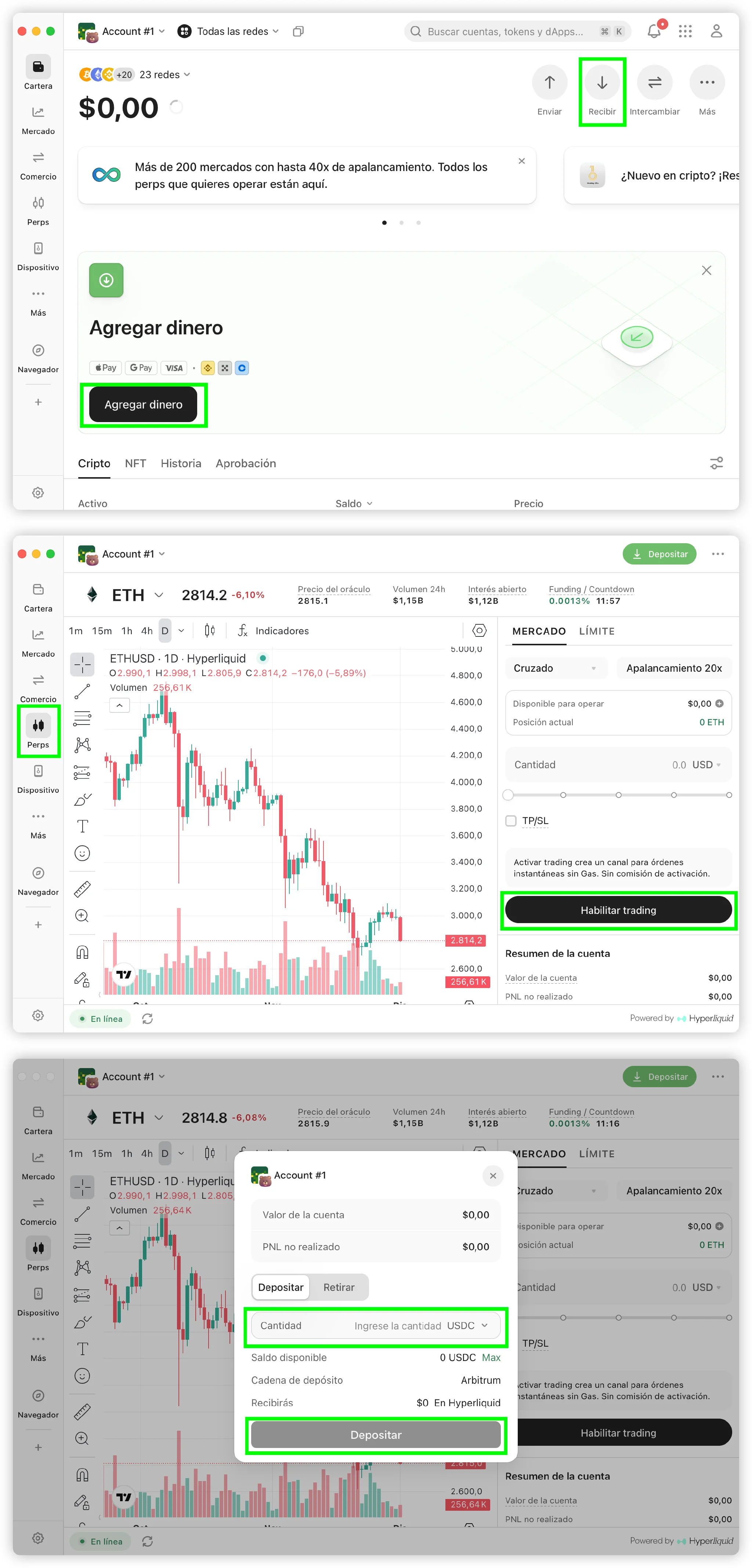 Abre la aplicación OneKey → Ve a "Perps" → Habilita el trading → Selecciona un token para depositar y completa el "Depósito".