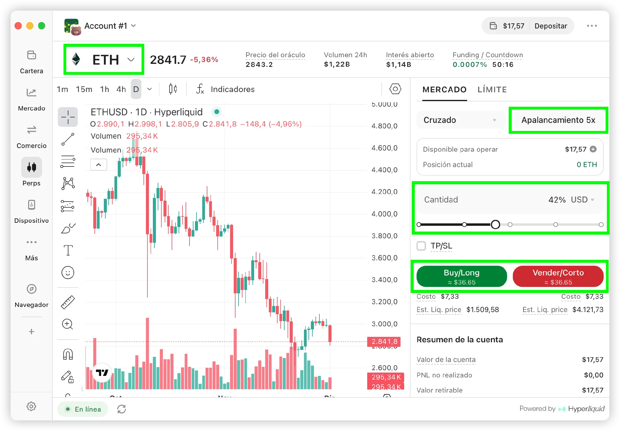 Selecciona un par de trading (por ejemplo, ETH), establece tu apalancamiento y tamaño de posición, revisa el precio de liquidación y luego elige ir largo (alcista) o corto (bajista).