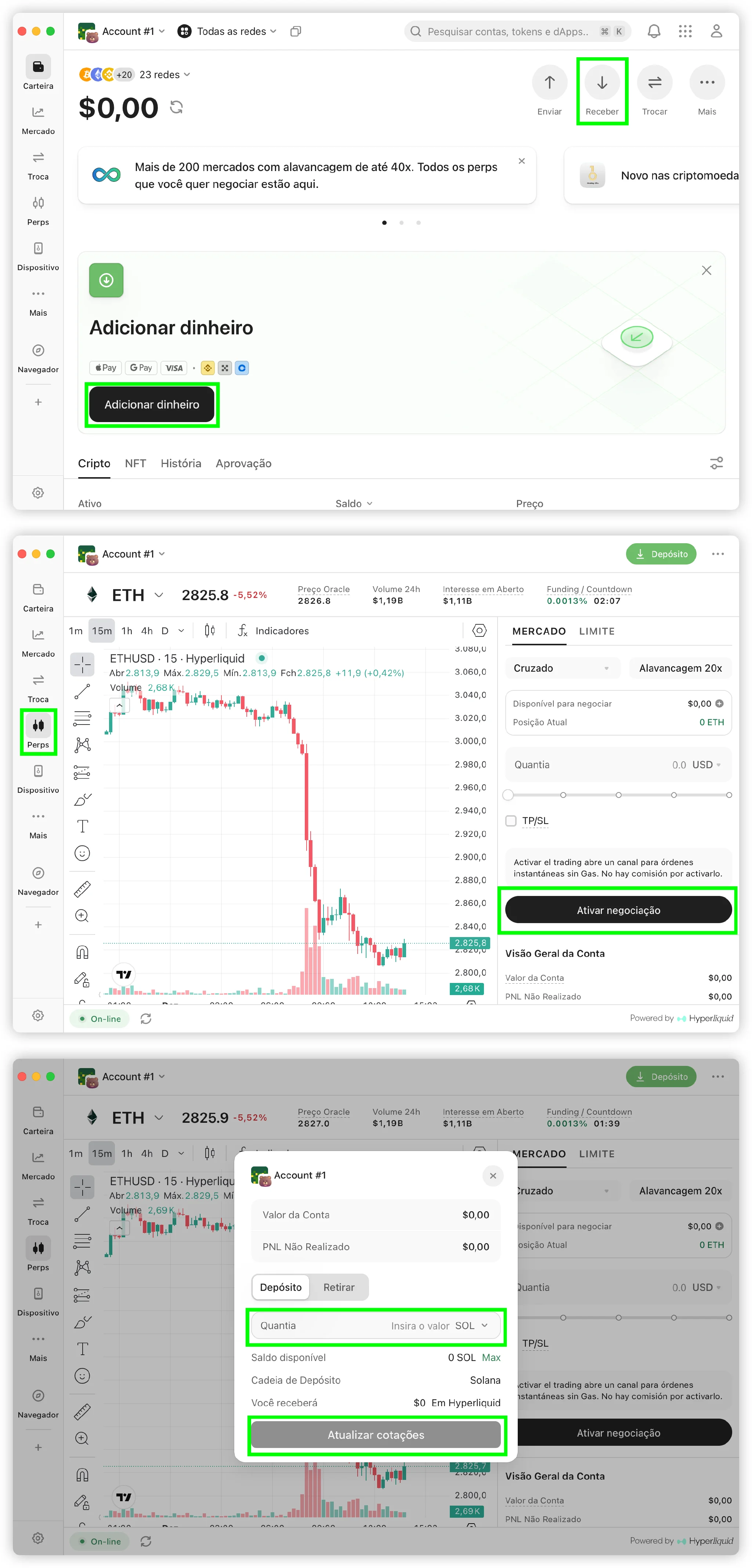 Abra o aplicativo OneKey → Vá para "Perps" → Ative a negociação → Selecione um token para depósito e complete o "Depósito".
