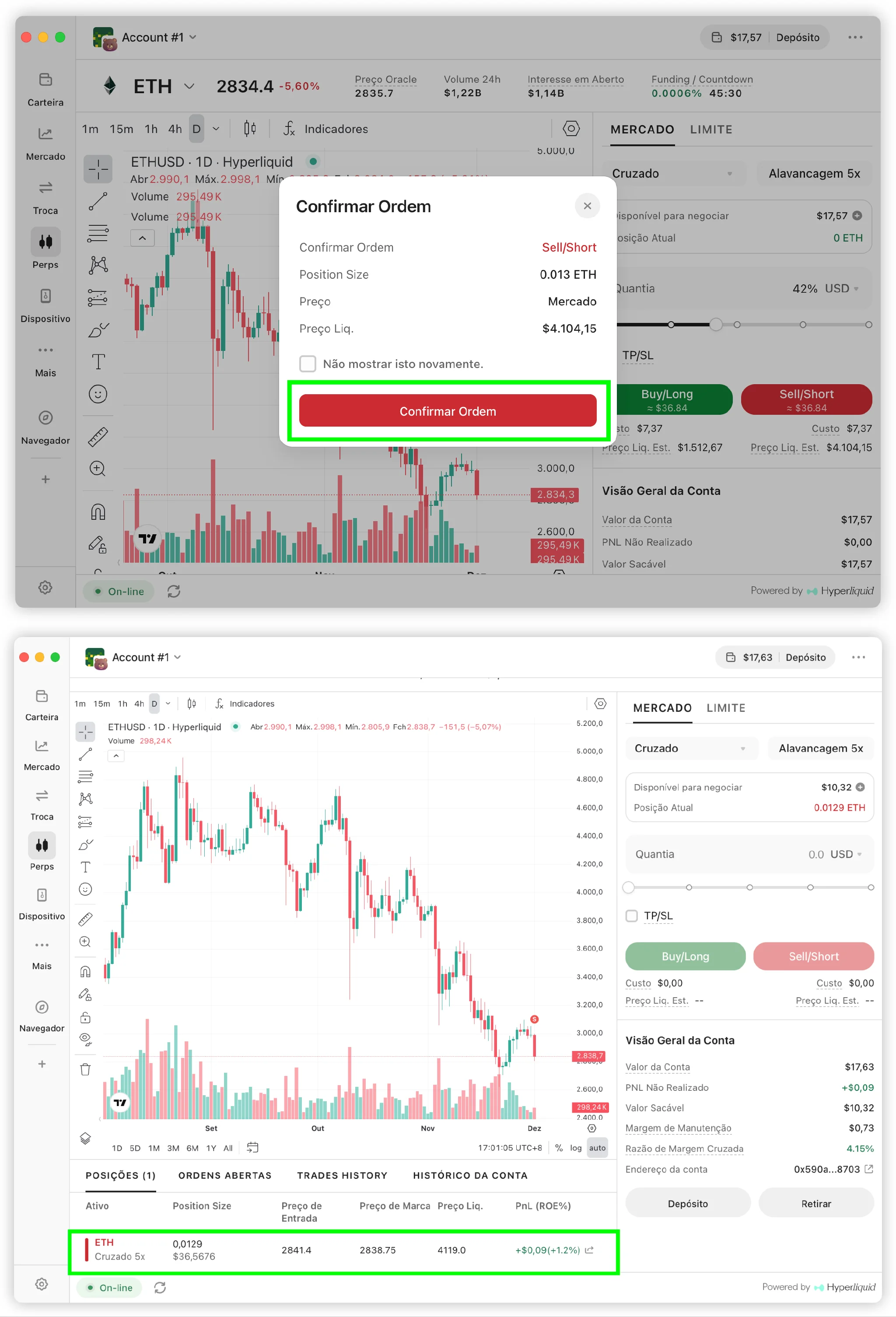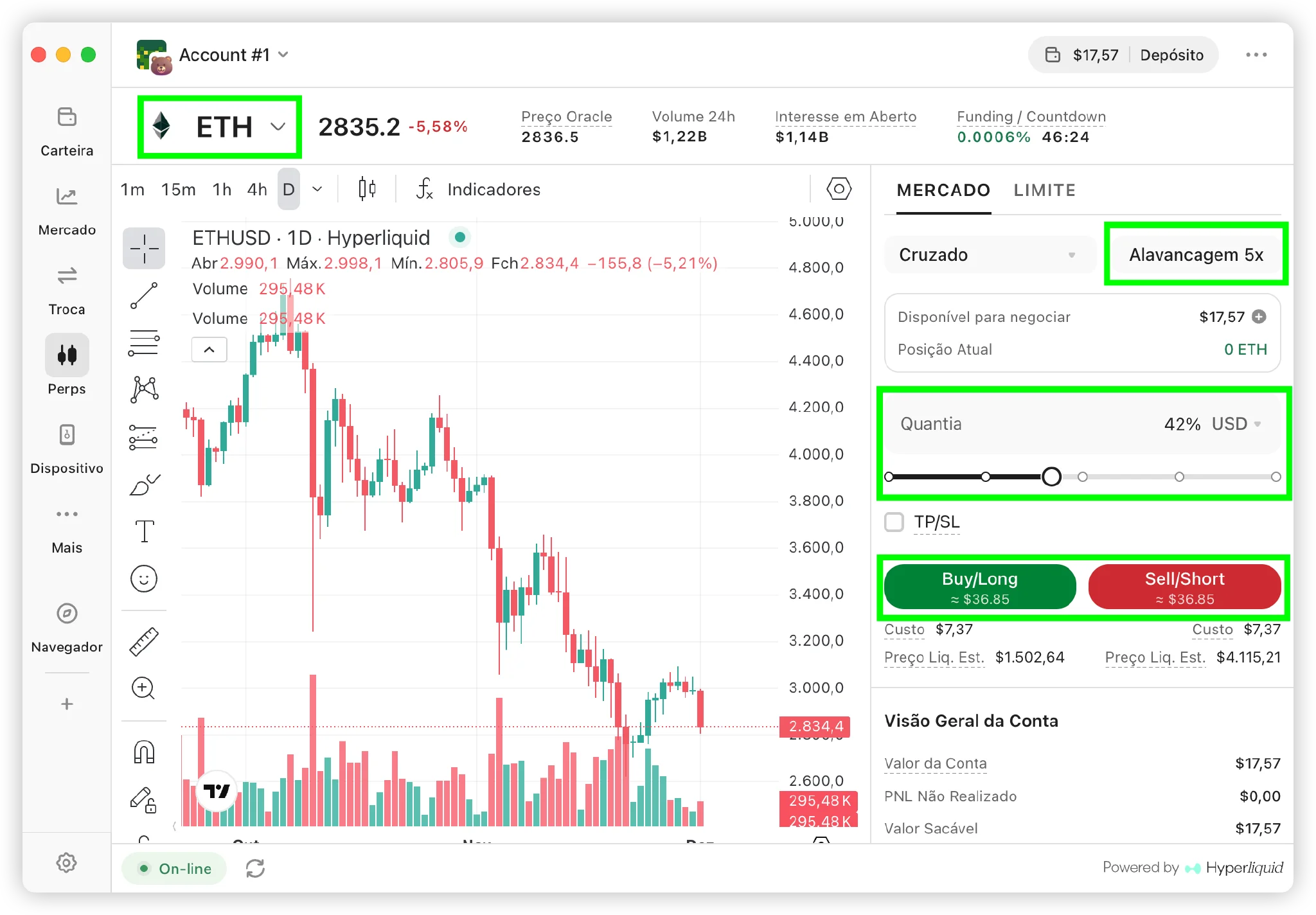 Selecione um par de negociação (por exemplo, ETH), defina sua alavancagem e tamanho da posição, revise o preço de liquidação e, em seguida, escolha ir para o lado comprado (otimista) ou vendido (pessimista).
