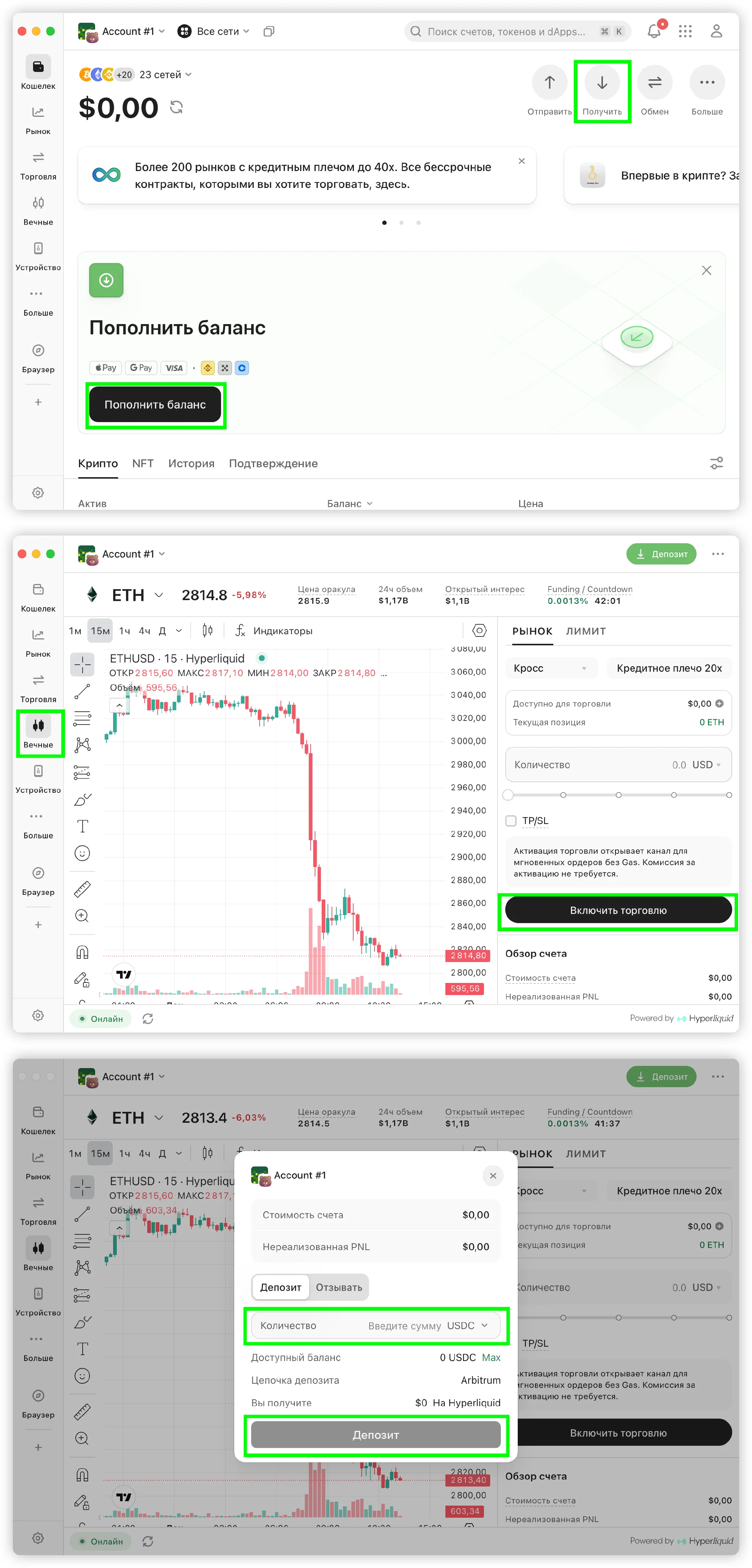 Откройте приложение OneKey → Перейдите во вкладку "Perps" → Включите торговлю → Выберите токен для депозита и завершите "Депозит".