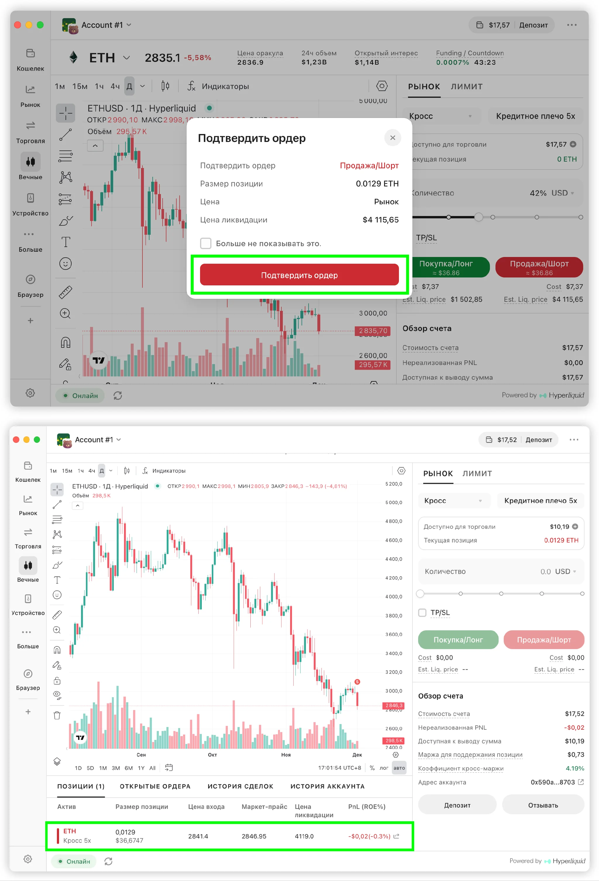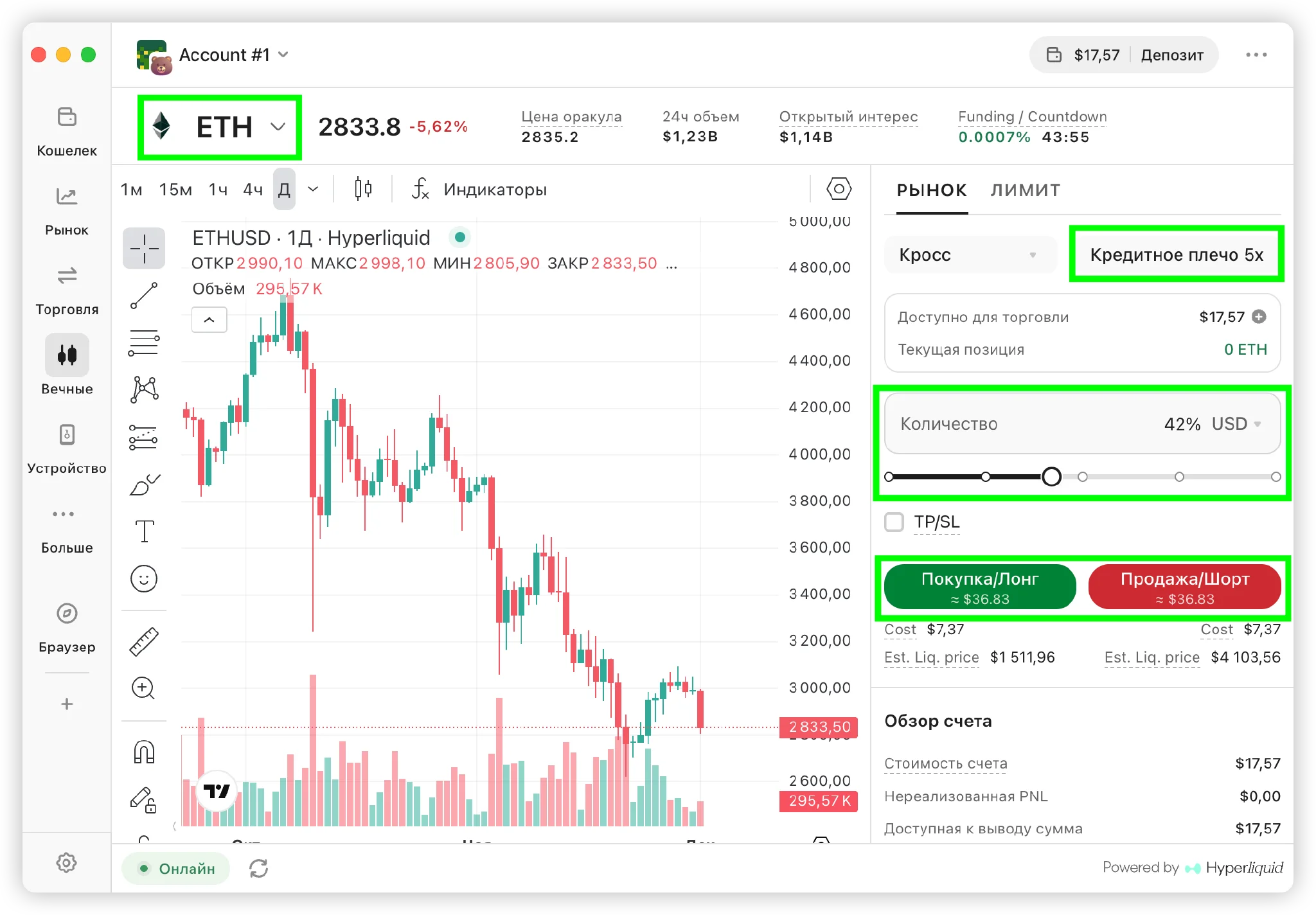 Выберите торговую пару (например, ETH), установите кредитное плечо и размер позиции, просмотрите цену ликвидации, затем выберите направление: длинная позиция (бычий тренд) или короткая позиция (медвежий тренд).