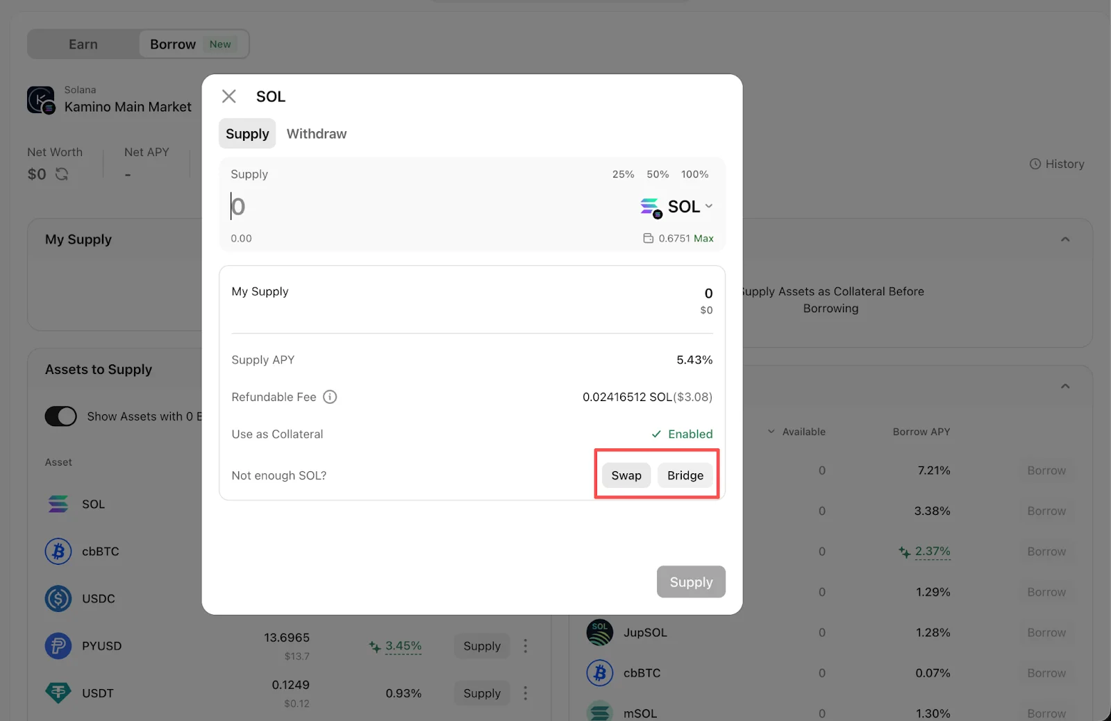Make sure your wallet holds assets that can be used as collateral, along with a small amount of on-chain gas for transactions.