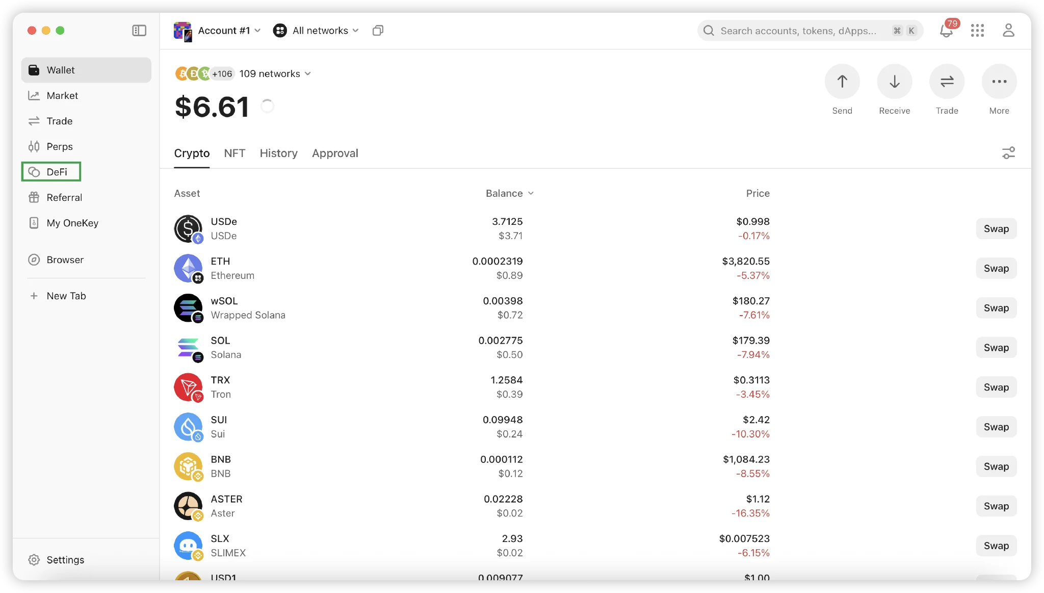 - Log in to the OneKey wallet main page and click “DeFi” in the left sidebar.