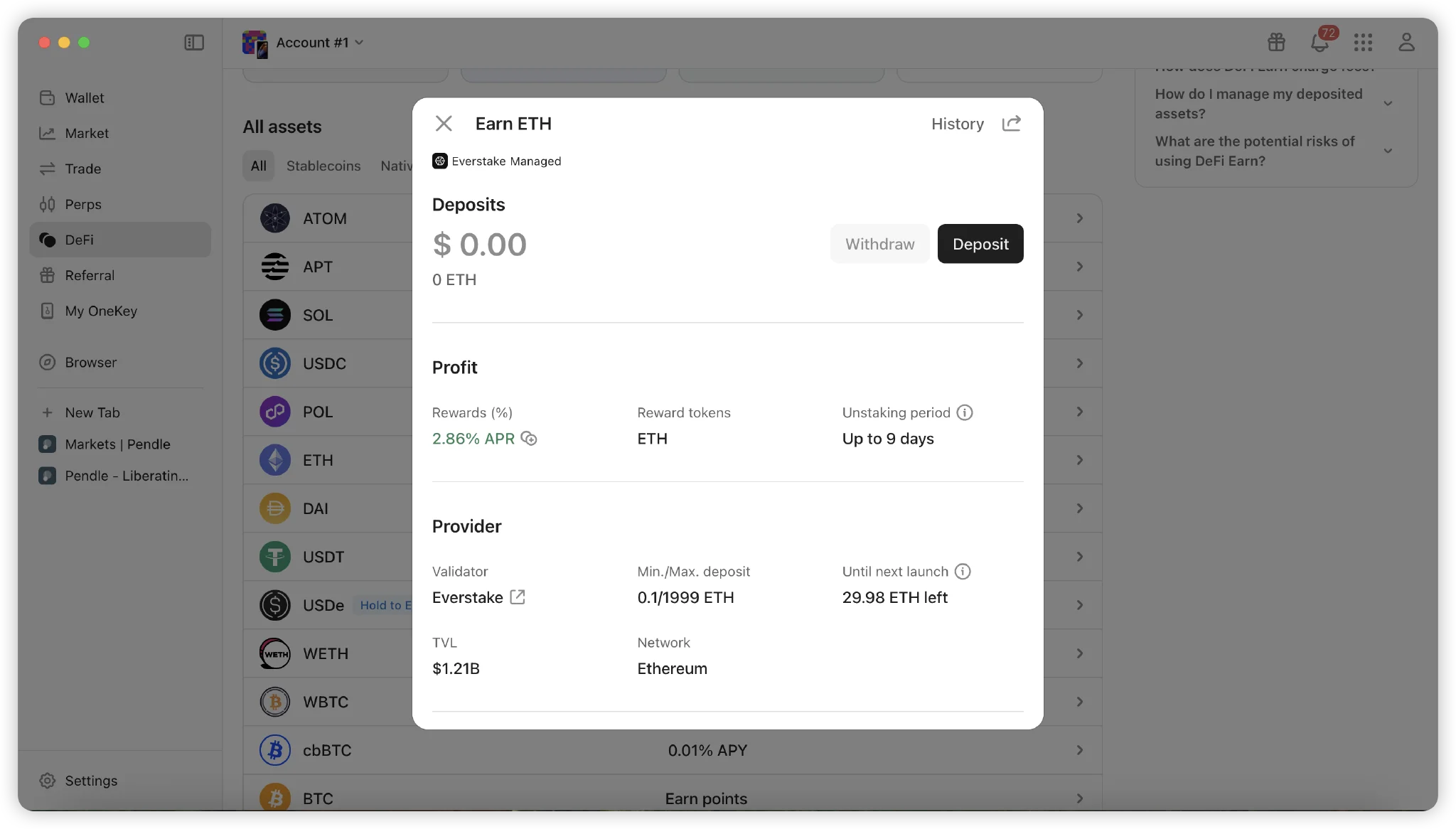 Introduction: Founded in 2018, Everstake is a decentralized staking provider that operates secure and reliable nodes for PoS protocols using enterprise-grade hardware to ensure maximum efficiency and safety. It serves over 1M delegators across 80+ blockchains. OneKey has integrated Everstake to offer users convenient staking services, currently supporting multiple assets (ETH, SOL, APT, ATOM, POL). The following example uses ETH.