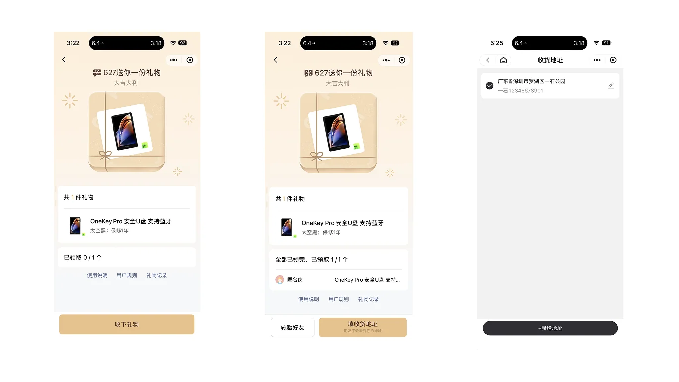 - 📦 收礼人填写地址后自动生成订单,由 OneKey 正常发货,全流程在微信内闭环完成