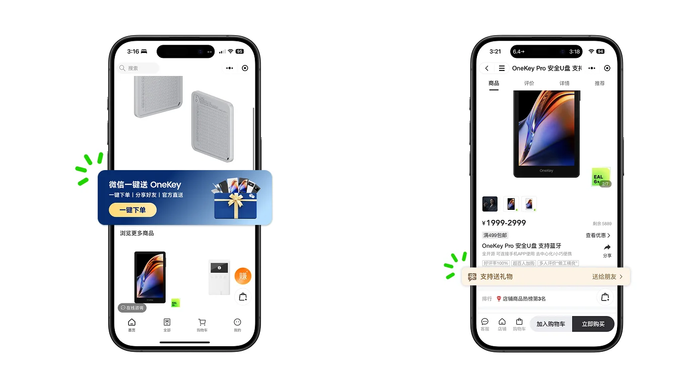 你在微信小程序里挑好 OneKey 商品并完成付款,通过一条消息发给好友或群聊;